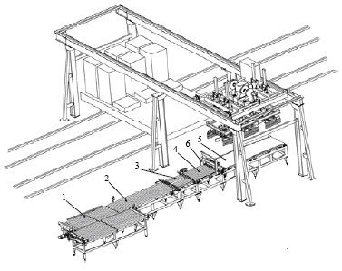 Висушені вироби, скомплектовані двома групами по 2 ряди, подаються по рольгангу (поз.1) від розвантажувача. При опусканні рольганга виробу виявляються на ланцюгах конвеєра (поз.2), звідки вони проміжним конвеєром (поз.3) передаються на той, що програмується (поз.4) і далі на комплектуючі (поз.5) конвеєри.