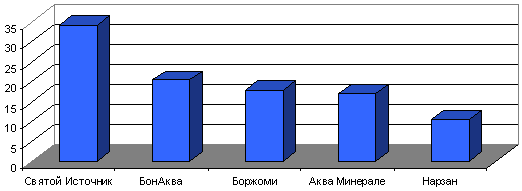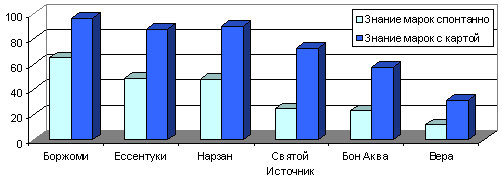 Наиболее известными марками минеральной воды оказались отечественные брэнды, существующие на рынке в течении многих десятков лет — «Боржоми» — 65% опрошенных сказали, что знают эту марку воды, «Ессентуки» (48,2%) и «Нарзан» (47,8%) (см. диагр. 1).