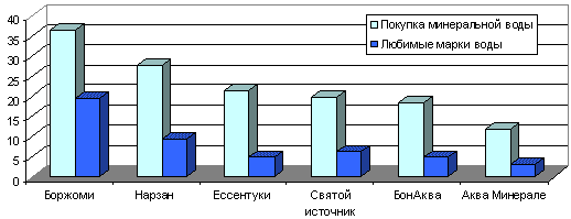 Знание марки продукта, также как и знание рекламы, не всегда свидетельствуют о том, что потребители охотно покупают сам продукт. Однако, данные исследования свидетельствуют о том, что лидерами продаж являются все те же марки минеральной воды — «Боржоми», покупаемый 36,3% респондентов, «Нарзан» — 27,8%, «Ессентуки» — 21,2%. Таким образом, российские потребители демонстрируют приверженность традиционным маркам минеральной воды. Лучшие показатели среди марок столовой воды имеет «Святой источник» — 19,8% респондентов покупают эту марку, 18,5% опрошенных покупают «БонАкву», 11,7% — «Аква Минерале».