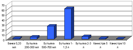 Таким образом, чаще всего респонденты покупают одну бутылку столовой или минеральной воды емкостью 1-1,5 л несколько раз в неделю. Учитывая тот факт, что собирались данные о частоте и объеме покупок в летний период, на который приходится пик продаж, можно предположить, что в среднем респонденты выпивают 2- 3 бутылки воды в неделю.
