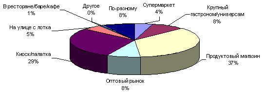 Чаще всего минеральную воду этим летом покупали в обычном продовольственном магазине, где помимо минеральной и столовой воды есть еще и другие продукты питания (см. диагр. 5). На втором месте по популярности — киоск/палатка — 29,3% процента городских жителей летом покупали здесь минеральную и столовую воду. Минеральную воду можно купить по дороге домой, на работу, во время прогулки, и киоск/палатка — оптимальное место для покупки, особенно в летний период, тем более, что в большинстве из них имеется холодильник, а прохладная минеральная вода, как известно, наилучшим образом утоляет жажду. Немногим более 8,4% респондентов покупают воду в крупных универмагах/гастрономах и еще 8,2% — на оптовых рынках. Эти торговые точки пользуются популярностью у людей, делающих покупки раз в неделю в торговых точках, имеющих самый разнообразный ассортимент, в том числе и минеральную воду. Около 4,7 % респондентов покупают воду с лотка на улице, но, учитывая сезонный фактор, можно предположить, что данный вид торговой точки популярен только в жаркий летний период, поэтому он не оказывает особенного влияния на структуру продаж. Еще 4,4% респондентов предпочитают покупать минеральную и столовую воду в супермаркетах.