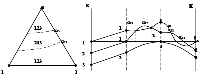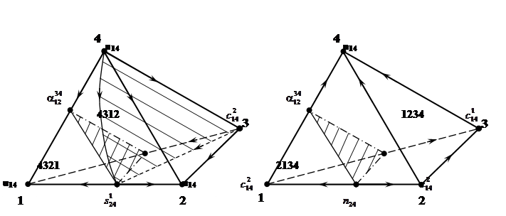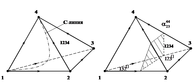 Для концентрационного симплекса приведенного на рис.4, б результаты могут отличаться для случая нахождения точки исходного состава в области К-упорядоченности 1324 и области 1234. Для каждого случая возможны по три варианта четких разделений, приведенных на рис. 5, и по одному варианту нечетких разделений, приведенных на рис. 6. Их появление однозначно связано с наличием в концентрационном симплексе единичной α-поверхности.
