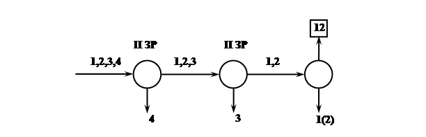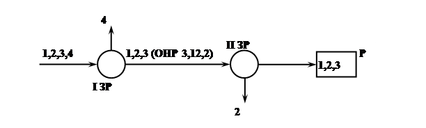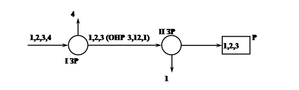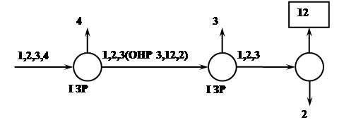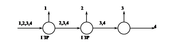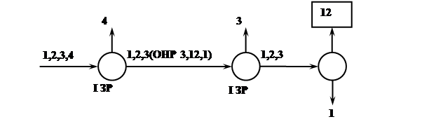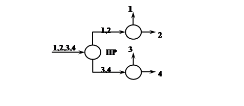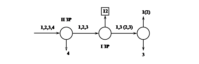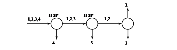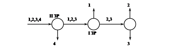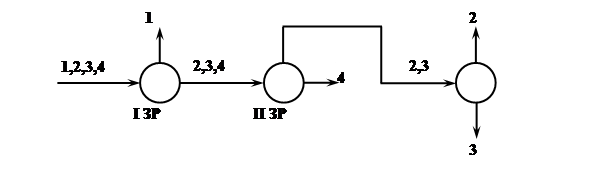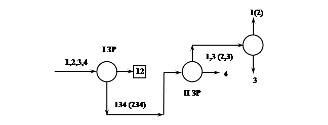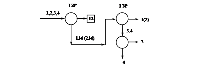 Рис.5. Варианты схем разделения для четырехкомпонентной зеотропной смеси в бинарных подсистемах которой α ~ соnst. IЗР – первое заданное разделение, IIЗР – второе заданное разделение,
