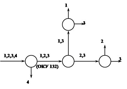 Сгенерируем варианты для первого типа исходной подвергаемой разделению смеси (рис.5). Учтя то, что смесь зеотропная и в бинарных подсистемах α ~ соnst, используются только четкие разделения без рециклов. Очевидно, что на стадии предварительного анализа все представленные варианты равнозначны. Применять какие либо специальные методы ректификационного разделения (если αij >1,3) малоэффективно. Уже на этом предварительном этапе формирования набора возможных схем следует учитывать некоторые технологические соображения. Например, для не очень стойких к температуре веществ желательно, что бы время их пребывания в кубах колонн было минимальным, следует планировать применение ректификации под вакуумом для снижения температуры процесса.