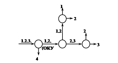 Предположим, что для симплекса приведенного на рис.4, г, точка исходного состава находится в области ректификации 4-3-12-1. Тогда, при допущении о линейности разделяющей поверхности, для четких разделений можно сгенерировать схемы, приведенные на рис.7, а. Как видно из рисунка, ни одна из схем не заканчивается полным разделением на чистые продукты. Очевидно, что надо применить некие дополнительные средства для преодоления этой ситуации. Если такими средства выбираются из ректификационных методов разделения, их называют специальные методы ректификации. Варианты схем для случая расположения точки исходного состава находящейся в области ректификации 4-3-12-2 приведены на рис.7, б. Для азеотропных смесей также следует учитывать наличие и расположение α-многообразий и их влияние на возможность появления дополнительных вариантов схем (на рис.7 не приведены).