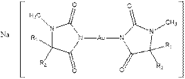 Первым из испытанных на противоартритную активность веществом, в котором золото (I) связано только с донорными атомами азота, является натрий-бис-(N-метилгидантоинато)-золото (I).