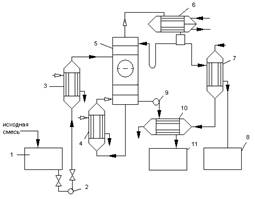 1 - емкость для исходной смеси; 2, 9 – насосы; 3 – теплообменник-подогреватель; 4 – кипятильник; 5 – ректификационная колонна; 6 – дефлегматор; 7 – холодильник дистиллята; 8 – емкость для сбора дистиллята; 10 – холодильник кубовой жидкости; 11 – емкость для кубовой жидкости