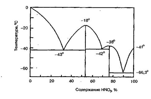Безводная азотная кислота (моногидрат HNO3 ) представляет бесцветную жидкость с температурой кристаллизации -41,6°С, температурой кипения — 82,6°С и плотностью — 1,513 г/м3 . Смешивается с водой во всех отношениях, образуя при этом индивидуальные соединения — гидраты состава HNO3 ·Н2 О и HNO3 · 3Н2 О, которые дают три эвтектики (рис. 1.1).