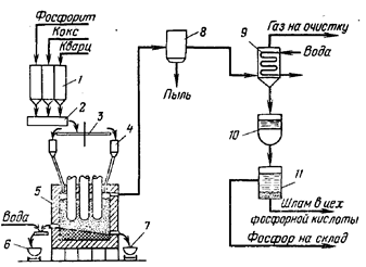 Рис 1. Схема производства фосфора : 1 — бункеры сырья; 2 — смеситель; 3 — кольцевой питатель; 4 — бункер шихты; 5 — электропечь; 6 — ковш для шлака; 7 — ковш для феррофосфора; 8 — электрофильтр; 5 — конденсатор; 10 — сборник жидкого фосфора; 11 — отстойник