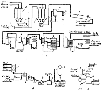 Рис. 4. Схемы утилизации отходов производства экстракционной фосфорной кислоты: а — при переработке фосфоангидрита в серную кислоту и цемент: 1 — сушилка; 2 — силосы; 3 — мельница; 4 — электрофильтры; 5 — циклон; 6 — вращающаяся печь; 7 - смеситель; 8 — холодильник; 9 — сушильная башня; 10 — конвертер; 11 — абсорбер; б — при переработке фосфогипса в сульфат аммония: 1—реактор для приготовления (NH4 )2 СО3 ; 2 — мельница; 3 —реакторы двойного замещения; 4—барабанный фильтр; 5 — реактор-нейтрализатор; 6 — многокорпусный выпарной аппарат; в —при переработке фосфогипса в сульфид кальция; 1—реактор 1; 2 — циклон; 3 — реактор II