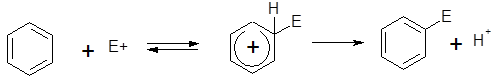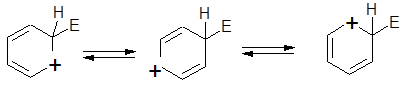 (аренониевый). В этом случае на первой стадии в результате атаки электрофила циклическая ароматическая 6-электронная π-система бензола исчезает и заменяется в интермедиате I на нециклическую 4-электронную сопряженную систему циклогексадиенильного катиона. На второй стадии вновь восстанавливается ароматическая
