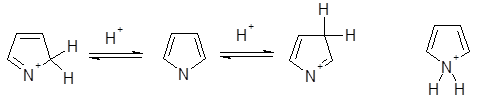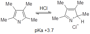 Значение рКа определено для большого числа производных пиррола, а сам незамещенный пиррол — чрезвычайно слабое основание со значением рКа -3,8. Основность пиррольного цикла весьма быстро увеличивается при введении алкильных заместителей, и для 2,3,4,5-тетраметилпиррола рКа равен +3,7, что соответствует полному протонированию всех молекул пиррола в вышеприведенных условиях (для сравнения рКа анилина +4,6). Таким образом, алкильные группы оказывают необычайное стабилизирующее влияние на катионы - пирролы, содержащие трет-бутильные группы, при протонировании образуют стабильные кристаллические соли.