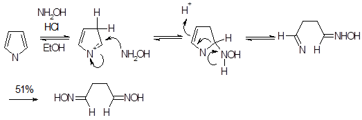 2Н- и ЗН-Пирролиевые катионы в сущности представляют собой иминиевые ионы и, следовательно, обладают свойствами электрофилов. Эти катионы играют ключевую роль в процессах полимеризации и восстановления пирролов в присутствии кислот. При взаимодействии пирролов с гидрохлоридом гидроксиламина, сопровождающимся раскрытием цикла и образованием 1,4-диоксимов, вероятно, образуется более реакционноспособный ЗН-пирролиевый катион. Для защиты аминогруппы первичных аминов могут быть превращены в 1-К-2,5-диметилпирролы, затем защитная группа может быть удалена с помощью описанной выше реакции с гидроксиламином.