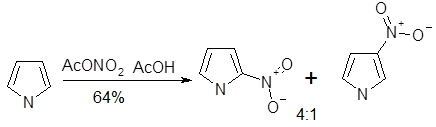 Нитрующую смесь, применяемую для нитрования производных бензола, нельзя использовать в случае пиррола, поскольку это приводит к его полному разложению. Однако нитрование пиррола возможно при использовании ацетилнитрата при низких температурах, причем преимущественно образуется 2-нитро-пиррол. Ацетилнитрат получают при смешивании дымящей азотной кислоты с уксусным ангидридом, и в результате образуется уксусная кислота и достигается удаление сильной минеральной кислоты. При нитровании пиррола с использованием ацетилнитрата активность положения 2 в 1,3 • 105 , а положения 3 в 3 • 104 раза выше активности бензола.
