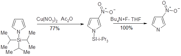 Введение заместителя к атому азота увеличивает долю продукта нитрования по положению 3 в смеси продуктов реакции: так, введение метального заместителя обусловливает получение смеси продуктов β- и α-нитрования в соотношении 1:3. Более объемная трет-бутильная группа приводит даже к обращению относительной реакционной способности — продукты β- и α-нитрования образуются в соотношении 4:1. Полного подавления реакции нитрования по α-положению пиррола можно достигнуть при введение к атому азота триизопропилсилильной (TIPS) группы; использование последней чрезвычайно важно при синтезе 3-производных, так как в последствии она может быть легко удалена.