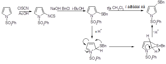 Катализируемая кислотой перегруппировка производных пиррола, содержащих серосодержащий заместитель в α-положении (продукт кинетически контролируемого электрофильного замещения), позволяет получать соответствующие β-изомеры.