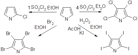 Галогенирование пиррола протекает настолько легко, что, если специальным образом не контролировать течение реакции, образуются исключительно стабильные тетрагалогенопроизводные. Попытки провести моногалогенирование простых алкилпирролов оказались безуспешными, поскольку при этом образуются чрезвычайно реакционноспособные пиррилалкилгалогениды - продукты галогенирования боковой цепи.