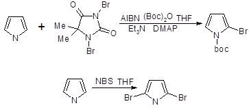 2-Бром - и 2-хлорпирролы — нестабильные соединения, которые можно получить прямым галогенированием пиррола. Использование 1,3-дибром-5,5-диметилгидантоина в качестве бромирующего агента приводит к образованию 2-бром - и 2,5-дибромпирролов; продукты бромирования стабилизируютнемедленным превращением в N-трет-бутилоксикарбонильные производные. Бромирование N-трет-бутилоксикарбонилпиррола с использованием N-бромсукцинимида приводит к 2,5-дибромпроизводному