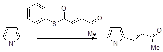 Моноалкилпроизводные пиррола (по атому углерода) не удается получить прямой реакцией пиррола с алкилгалогенидами как в результате катализируемого кислотой Льюиса алкилирования, так и в отсутствие катализатора. Пиррол не вступает в реакцию с метилиодидом при температурах ниже 100˚С, однако при температурах выше 150˚С в результате серии превращений образуется сложная смесь, состоящая главным образом из продуктов полимеризации и некоторого количества полиметилированных производных пиррола. Более реакционноспособный аллилбромид реагирует с пирролом при комнатной температуре, однако в результате этого взаимодействия образуется смесь различных аллилпирролов (от моно - до тетразамещенных) одновременно с продуктами олигомеризации и полимеризации. Наиболее гладко пиррол моноалкилируется сопряженными енонами, содержащими уходящую группу в β-положении.