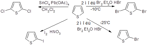 Галогенирование тиофена происходит очень быстро и как при комнатной температуре, так и при -30 °С в темноте легко проходит тетразамещение . Скорость галогенирования тиофена при 25 °С примерно в 108 раз больше, чем бензола. Образование как 2,5-дибром - и 2,5-дихлортиофенов, так и 2-бром- и 2-иодтиофенов гладко происходит в различных контролируемых условиях. Контролируемое бромирование 3-бромтиофена дает 2,3-ди-бромтиофен.
