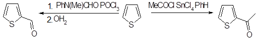 Ацилирование по Фриделю-Крафтсу наиболее часто используется для тиофенов и обычно дает хорошие выходы в контролируемых условиях. Несмотря на то, что при взаимодействии тиофена с AlCl3 получаются смолы, их образования можно избежать, если добавлять катализатор к тиофену и ацилирующему агенту. Наиболее часто в качестве катализатора используют хлорид олова. Эффективный метод — ацилирование ангидридами, катализируемое фосфорной кислотой. В реакциях с ацетил-п-толуолсульфонатами в отсутствие катализаторов с высоким выходом образуется 2-ацетилтиофен. При формилировании тиофена по Вильсмейеру получают 2-формилтиофен. 2-Формилпроизводное образуется также из 3-фенилтиофена в условиях реакции Вильсмейера.