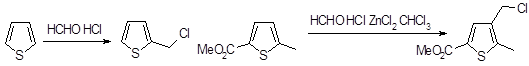 Кислотно-катализируемые реакции тиофена с альдегидами и кетонами неприменимы для получения гидроксиалкилтиофенов, так как они нестабильны в условиях реакции. Однако можно осуществить хлоралкилирование, а при использовании хлорида цинка даже тиофены, имеющие электроноакцепторные заместители, вступают в эту реакцию. Необходимо тщательно подбирать условия, так как возможно образование как ди-2-тиенилметанов, так и 2,5-бис(хлорметил)тиофена.
