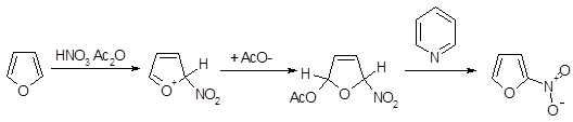 Чувствительность фуранов не позволяет использовать концентрированную кислотную нитрующую смесь. При взаимодействии фурана или замещенных фуранов с ацетилнитратом первоначально образуются неароматические аддукты, в которых образованию продуктов замещения препятствует процесс нуклеофильного присоединения ацетата к катионному интермедиату, обычно по положению 5. Ароматизация с потерей уксусной кислоты, приводящая к образованию нитропроизводного, происходит под действием растворителя; наилучшие результаты достигаются при использовании слабого основания, такого, как пиридин.