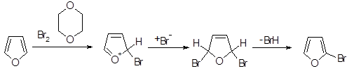 Фуран энергично реагирует с хлором и бромом при комнатной температуре с образованием полигалогенированных соединений, но не реагирует с иодом. В более контролируемых условиях можно получить 2-бромфуран. реакция, по-видимому, протекает через образование 1,4-дибром-1,4-дигидроаддукта, поскольку такие частицы были действительно обнаружены при низкой температуре с использованием спектроскопии ПМР. В реакции с бромом в диметилформамиде при комнатной температуре гладко образуются 2-бром - и 2,5-дибромфураны.