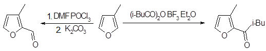 Формилирование фуранов по Вильсмейеру обеспечивает удобный подход к формилфуранам, хотя не меньшую роль играют легкая доступность фурфурола в качестве исходного материала, а также важны методы, включающие литиирование фуранов. Формилирование замещенных фуранов происходит согласно правилу предпочтительного образования α-замещенных производных, несмотря на все другие факторы; так, и 2-метилфуран, и метиловый эфир фуран-3-карбоновой кислоты дают 5-альдегид, а 3-метилфуран превращается главным образом в 2-альдегид.