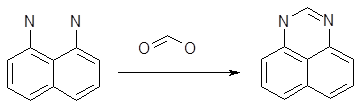Перимидин - единственная гетероароматическая система с пиридиновым атомом азота, подвергающаяся сравнительно легкому ацилированию по Фриделю — Крафтсу. Ацилирование лучше всего проводить с помощью карбоновых кислот в среде полифосфорной кислоты (ПФК). Для соединений с незамещенной группой NH реакция имеет ярко выраженный кинетический и термодинамический контроль. При 70—85° образуется главным образом 6(7)-ацилпроизводное (55—85%) наряду с небольшим количеством 9-изомера. При 120—150° единственным продуктом реакции становятся 4(9)-ацилперимидины. Одной из причин повышенной устойчивости последних является наличие в них прочной внутримолекулярной водородной связи.