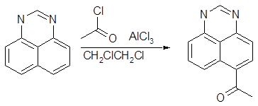 В коническую колбу емкостью 150мл, снабженную магнитной мешалкой и хлоркальциевой трубкой помещают 7,9г безводного хлористого алюминия, 0,52мл хлористого ацетила в 20мл дихлорэтана и в течение 1часа при перемешивании добавляют 1г перимидина, поддерживая при этом температуру 18-20’С. После добавления последней порции перимидина перемешивание продолжают еще 2часа (контроль ТСХ, проявляют хроматограмму парами иода). Затем реакционную массу тонкой струей выливают в воду (осторожно вспенивание и разогревание). Чтобы избавится от избытка дихлорэтана смесь нагревают. Выпавший кристаллический осадок фильтруют и промывают водой.