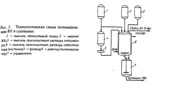 1. В отличие от блочного метода, при котором готовится смесь жидкого мономера и инициатора, суспензионный метод основан на смешении в водной среде жидкого мономера (ВХ), инициаторов, стабилизаторов эмульсии и других добавок. Это дает существенное достоинство – эффективный теплоотвод тепла реакции, что позволяет получить полимер с узким молекулярно-массовым распределением. Но это несет и свои недостатки – реакционная система достаточно многокомпонентна, что влечет за собой трудность выделения из водной смеси готового полимера, следовательно, возникает необходимость в дополнительном оборудовании фильтрации и сушки. Кроме этого, снижается чистота получаемого продукта.