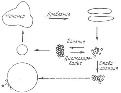 Суспензионная полимеризация винилхлорида проводится в присутствии растворимого в мономере инициатора (органическая перекись или азосоединение), воды и защитного коллоида. Механизм диспергирования мономера в водной среде схематически изображен на рис. 3. При перемешивании мономера с водой устанавливается динамическое равновесие между дроблением мономера на капли и обратным процессом их слияния (коалесценция). С введением в среду защитного коллоида на поверхности капли мономера образуется защитный слой, и капля стабилизируется. Молекулы защитного коллоида располагаются на поверхности раздела фаз так, что их гидрофобные части (обычно углеводородная цепь) направлены в сторону мономера, а гидрофильные – в сторону воды. Размеры образующихся капель (дисперсность эмульсии) зависят от интенсивности перемешивания и свойств защитного коллоида.