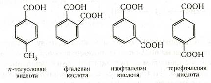 Ароматические кислоты могут быть разделены по количеству карбоксильных групп на одно-, двух- и более основные. Названия кислот, у которых карбоксильная группа непосредственно связана с ядром, производятся от ароматических углеводородов. Названия кислот с карбоксилом в боковой цепи производятся обычно от наименований соответствующих кислот жирного ряда. Наибольшее значение имеют кислоты первого типа: например, бензойная (бензолкарбоновая) С6 Н5 —СООН, п- толуиловая (п -толуолкарбоновая), фталевая (1,2-бензолдикарбоновая), изофталевая (1,3-бензолдикарбоновая), терефталевая (1,4-бензолдикарбоновая):