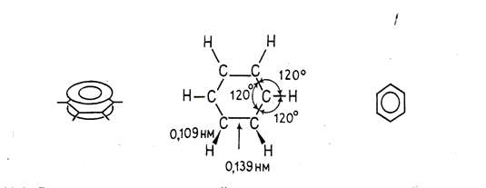 Отсюда следует, что формулу бензола логично изображать в виде правильного шестиугольника с кольцом внутри, подчеркивая тем самым полную делокализованность π-электронов в бензольном кольце и равноценность всех углерод-углеродных связей в нем. Справедливость последнего заключения подтверждена, в частности, результатами измерения длин С—С-связей в молекуле бензола; они одинаковы и равны 0,139 нм (С—С-связи в бензольном кольце короче ординарных (3,154 нм), но длиннее двойных (0,132 нм)). Распределение электронной плотности в молекуле бензола; длины связей, валентные углы