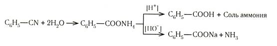 2. Из бензонитрила, который для этого гидролизуют кислотой или щелочью: 2Н2 О С6Н5СN ¾¾® С6Н5СООН + NH3