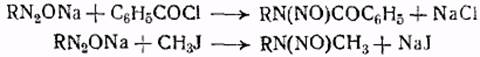 При взаимодействии солей диазотатов с йодистыми алкилами образуются вторичные нитрозамины, с галоидангидридами кислот — нитрозоанилиды. При взбалтывании хлористого бензоила со щелочным раствором фенилдиазотата натрия образуется нитрозобензанилид. При действии уксусного ангидрида на щелочной раствор р -толилдиазотата натрия образуется нитрозоацетат-р -толуидид: