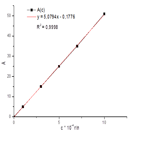 Для построения градуировочного графика в 5 мерных колб на 100 мл вносим 1,0; 3,0; 5,0; 7,0; 10,0 мл раствора с концентрацией железа 0,01 г/л и доводим до метки дистиллированной водой. В результате получаем растворы с концентрациями железа 1*10-4 ; 3*10-4 ; 5*10-4 ; 7*10-4 ; 10*10-4 г/л.
