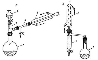 Приборы для проведения синтезов с азеотропной отгонкой воды: а – с холодильником Либиха, б – с шариковым холодильником, 1 – реакционная колба, 2 – двурогий форштосс, 3 – капельная воронка, 4 – «ловушка» для воды, 5 – обратный холодильник.