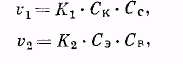 где v 1 — скорость реакции этерификации; v 2 — скорость реакции гидролиза; К1 и К2 — константы скорости обеих реакций; Ск , Сс , Сэ и Св — концентрации реагирующих и получающихся веществ (кислоты, спирта, эфира, воды).