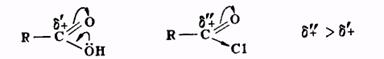Карбоновые кислоты, как видно из вышесказанного, реагируют со спиртами относительно медленно. Это объясняется слабой активностью карбонильной группы в кислотах по отношению к нуклеофильным агентам по сравнению с активностью той же группы в ангидридах и хлорангидридах кислот, поскольку +М -эффект гидроксильной группы приводит к уменьшению положительного заряда карбонильного углерода