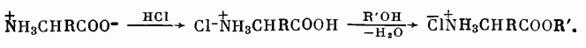 Аминокислоты образуют сложные эфиры при взаимодействии со спиртами в присутствии сухого хлористого водорода. Роль хлористого водорода здесь не ограничивается катализом реакции или сдвигом равновесия за счет связывания воды. В присутствии хлористого водорода аминокислота, находившаяся ранее в форме внутренней соли, превращается в хлористоводородную соль аминокислоты, причем карбоксильная группа из неактивной формы аниона переходит в реакционноспособную форму —СООН: