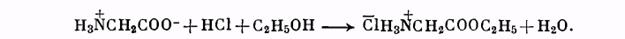 В результате этерификации в этих условиях эфиры также получаются в виде солей. Например, из аминоуксусной кислоты (гликоколя) и абсолютного этилового спирта образуется хлористоводородная соль эфира гликоколя