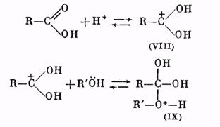 Роль катализатора заключается в протонировании карбонильного кислорода: при этом карбонильный атом углерода становится более положительным и более «уязвимым» по отношению к атаке нуклеофильного агента, которым является молекула спирта. Образующийся вначале катион (VIII) присоединяет молекулу спирта за счет неподеленных электронов кислородного атома, давая катион (IX):