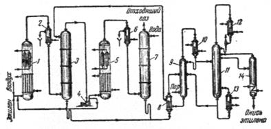 Из контактных газов после второй ступени окисления окись этилена извлекают водой в абсорбере 7 второй ступени. Из абсорберов 3 и 7 водный раствор окиси этилена через теплообменник 8 направляют в отпарную колонну 9. Отгоняемая из этой колонны паро-газовая смесь поступает через дефлегматор 10 на разделение в ректификационную колонну 11 . Окончательная очистка окиси этилена от CO2 производится в колонне 14. Получаемый по этому способу продукт представляет собой 99,5%-ную окись этилена.