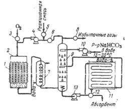1) змеевик для обогрева и охлаждения реактора, 2) реактор, 3) вентиль для подачи кислорода, 4) циркуляционный насос, 5) вентиль для подачи реакционной смеси, 6) вентиль для подачи рециркуляционного газа, 7) холодильник. 8) вентиль для отвода избыточных газов, 9) скруббер, 10) насос орошения скруббера, 11) холодильник для адсорбента, 12) вентиль для подачи адсорбента на ректификацию, 13) насос для отвода адсорбента.