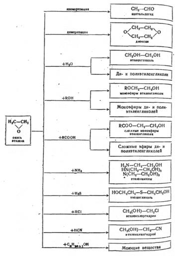 Окись этилена вступает также и в много других реакций с другими веществами, практически важные реакции мы рассмотрим ниже в разделе, касающемся применения окиси этилена.
