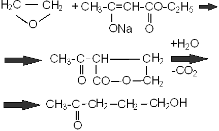 В растворе этанола при 0ºС окись этилена реагирует с натрийацетоуксусным эфиром. Образующийся при этом ацетобутиролактон в присутствии разбавленной серной кислоты дает