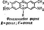 Это типичные основные красители, которые при сульфировании образуют кислотные красители. Сами по себе феназины бесцветны, но их четвертичные соли окрашены достаточно интенсивно. Технология азиновых красителей была разработана в период 1880—1900 г.г. усилиями Витта, Каро, Штраубе, Герпа и других. В результате этих работ появились эуродин и сафранин (N-алкил- и фенилпроизводные феназинов), а также более сложные по строению индулины и нигрозины. Химическая структура этих красителей была выяснена значительно позже, в 20-х годах нашего столетия, благодаря исследованиям Керманна, но сама технология не претерпела существенных изменений со времени первооткрывателей, за исключением некоторых новых красителей, полученных уже 1900-х годах. До настоящего времени многие из этих красителей имеют важное техническое и коммерческое значение. Достаточно сказать, что в США производство только одного нигрозина, применяемого для типографских красок, лент пишущих машин, кремов для обуви и т. д., достигает 4 тыс. т в год. —Строение самого простого сафранинового красителя ярко-красного цвета, сафранина Б, показано формулой.