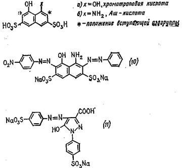 Важнейшими полупродуктами для синтеза кислотных азокрасителей являются нафтиламины, нафтолы, сульфированные аминонафтолы, среди которых наибольшее значение имеют хромотроповая кислота и аш-кислота. На основе этих кислот получают большое количество технически важных дисазокрасителей. В качестве примера приведем строение сине-черного красителя на основе аш-кислоты.